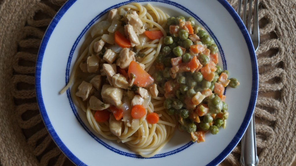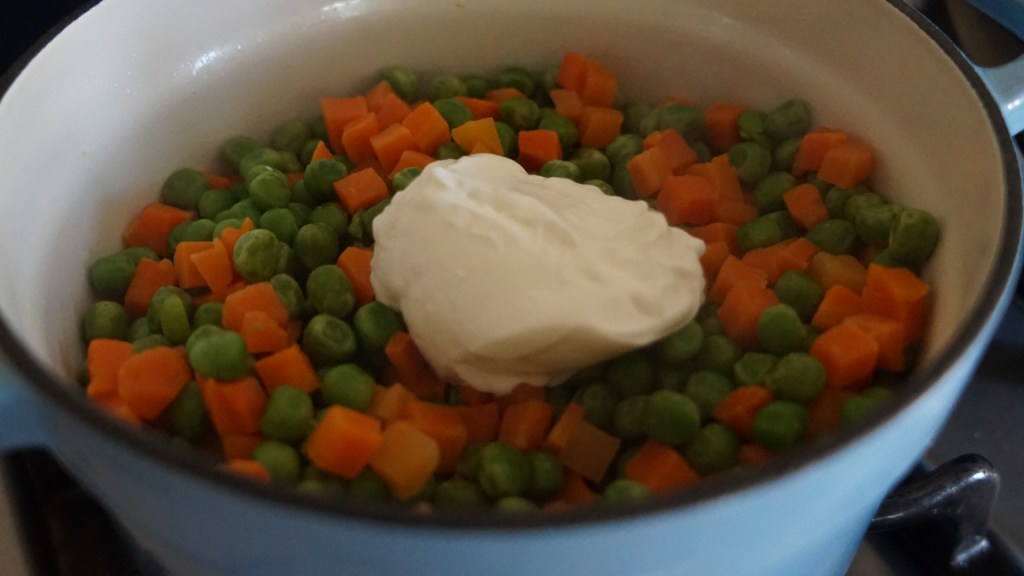 Her recipe calls for fresh carrots and peas. I use frozen. When you use frozen veggies, you dramatically cut the cooking time. Quick is what we all need now, especially during the week.