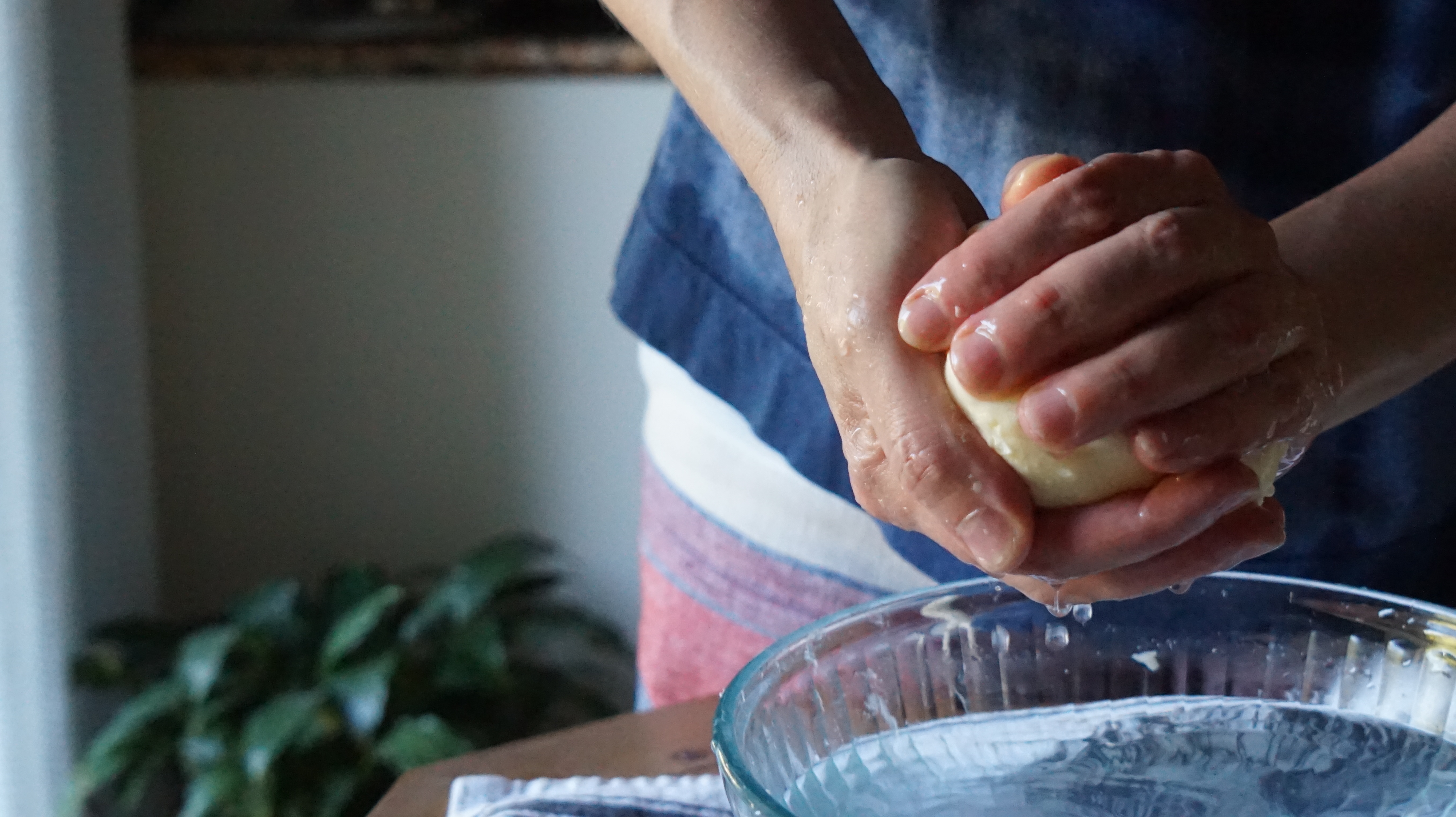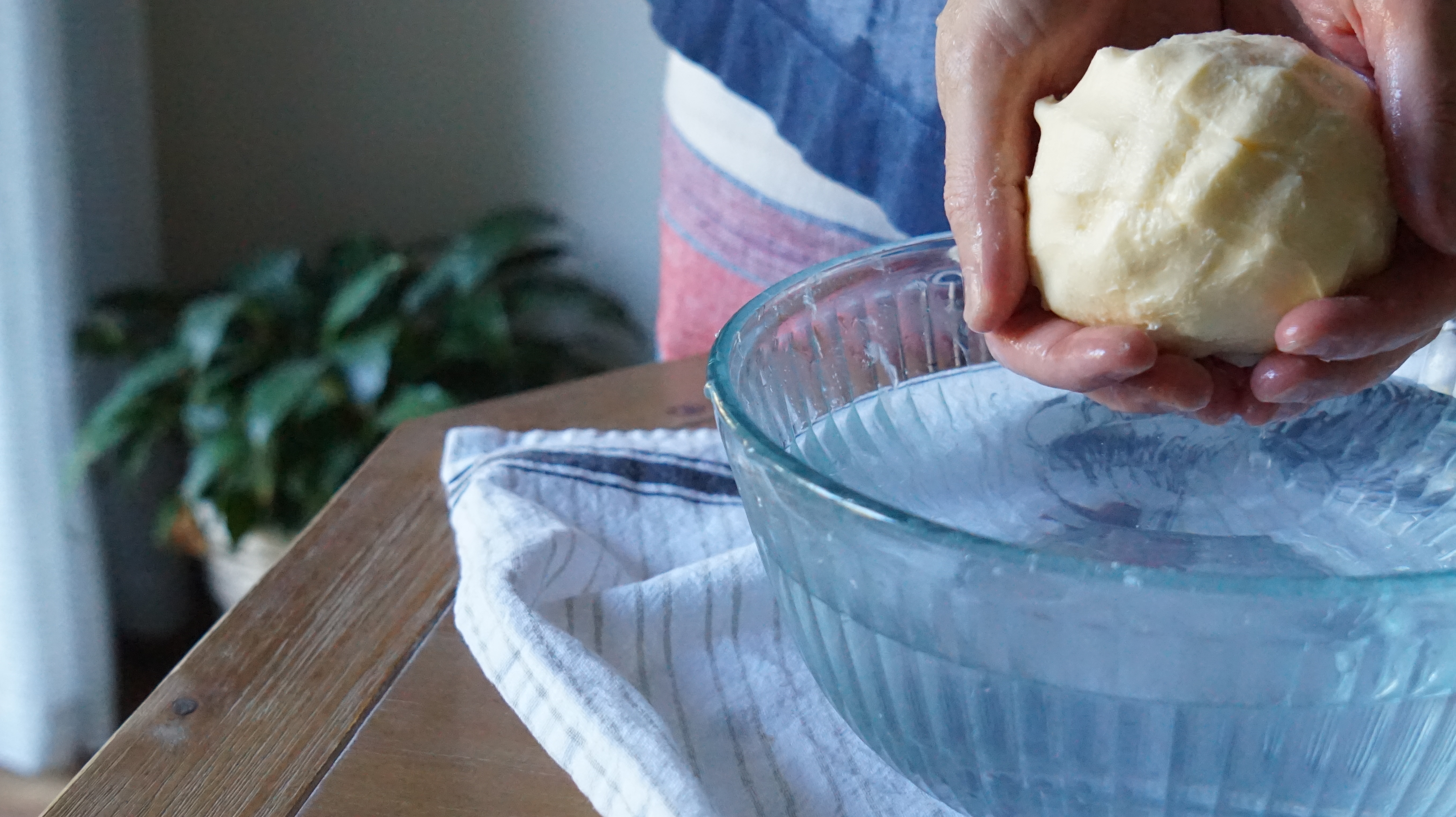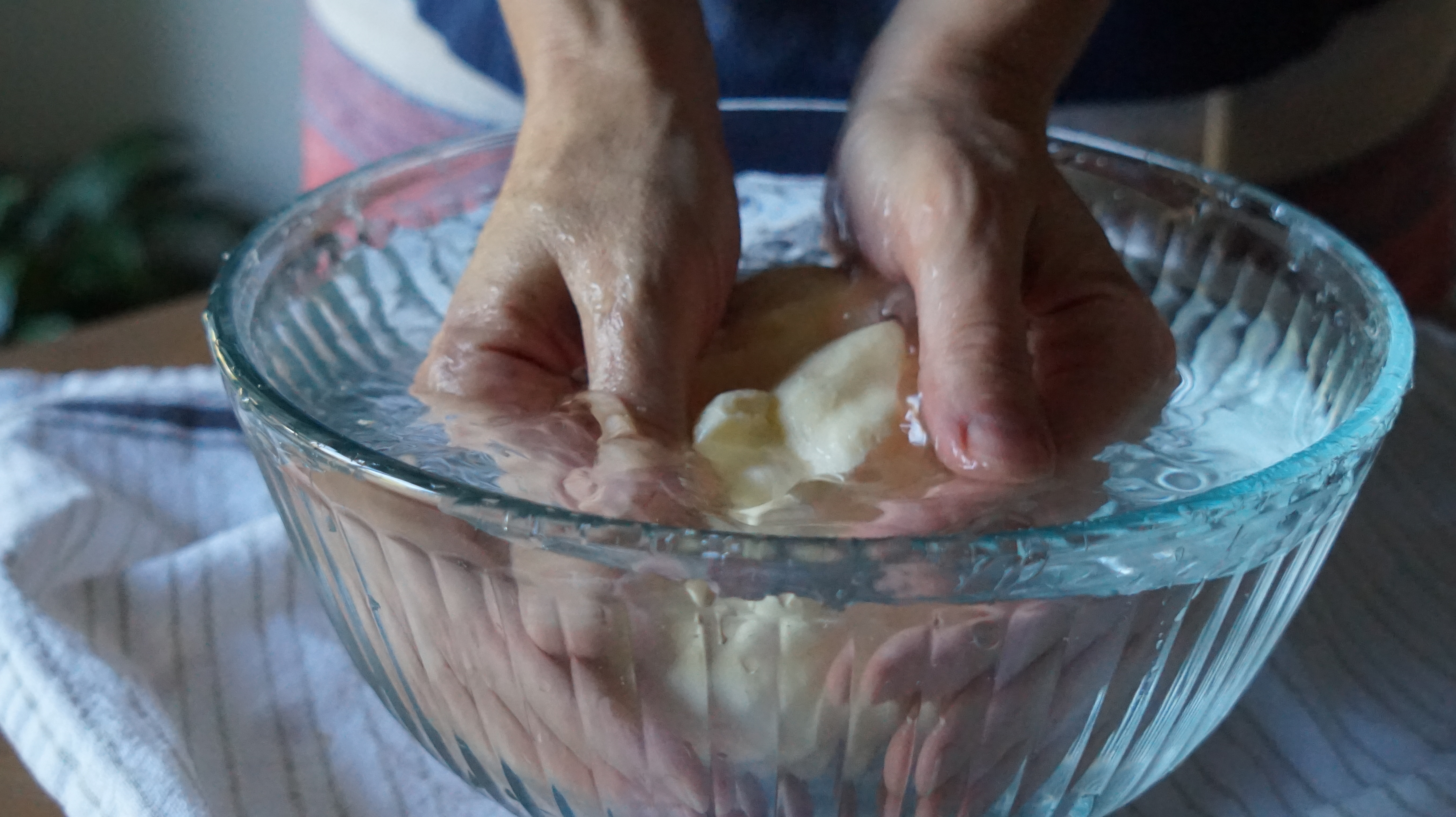 Drain the butter and wash it in the prepared bowl. You may need to change the water a few times while washing the butter. Do this until the water in the bowl is clear, not milky. Some people do this step right in the sink under a running facet with cold water.