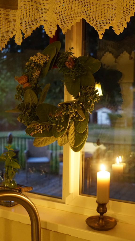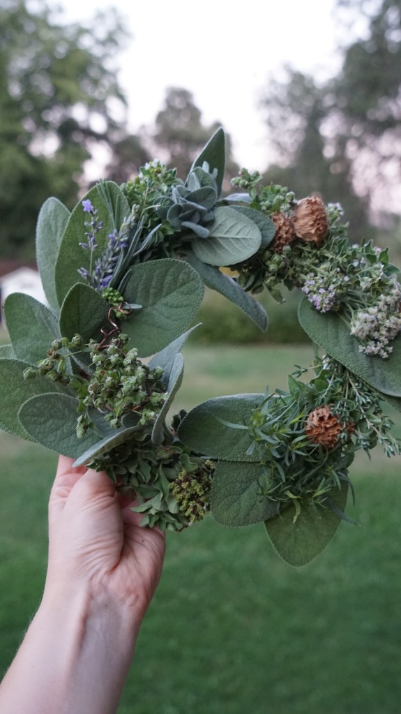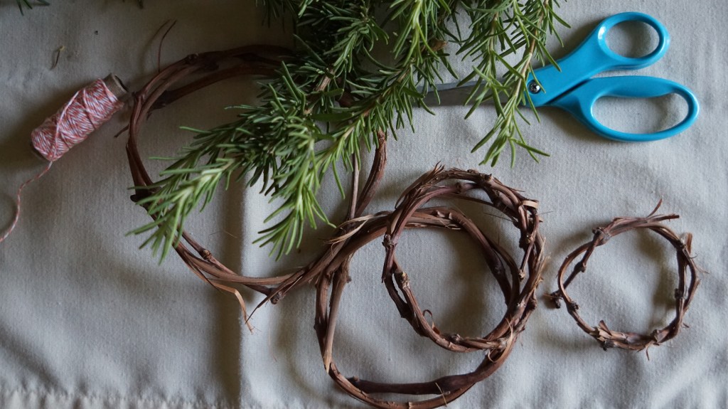 The abundance of herbs in my garden gave me an idea to try to make an herb wreath. At the end of last year during the heavy pruning of my grapes, I made small wreath bases/frames. I saved some cuttings to grow more grape plants and then used the youngest stems for bases. They were flexible enough to be shaped into round frames.