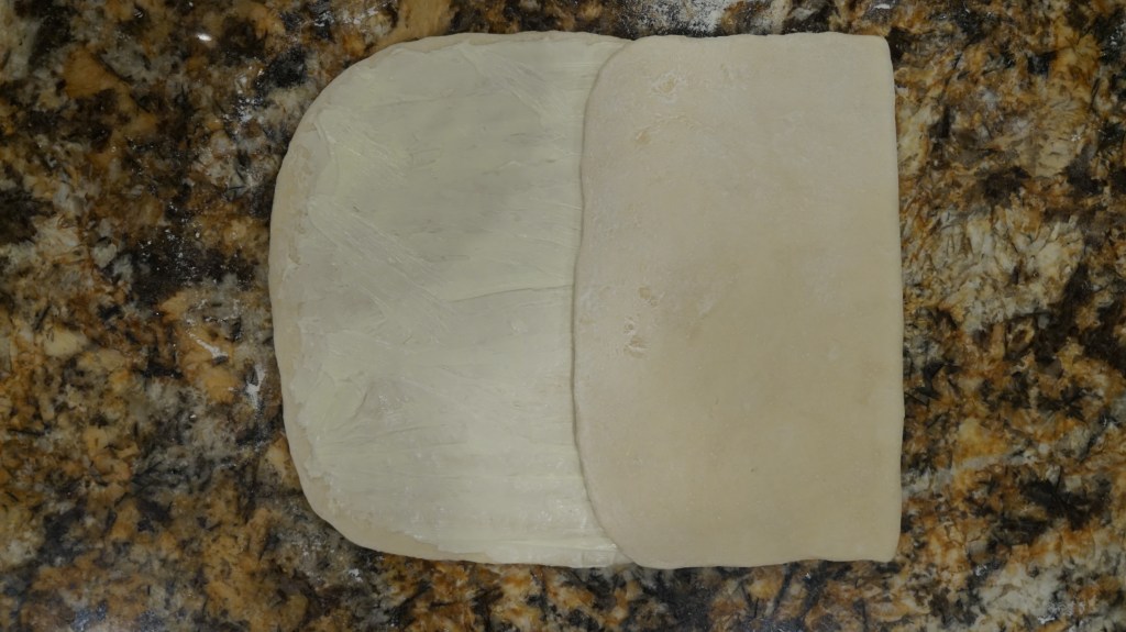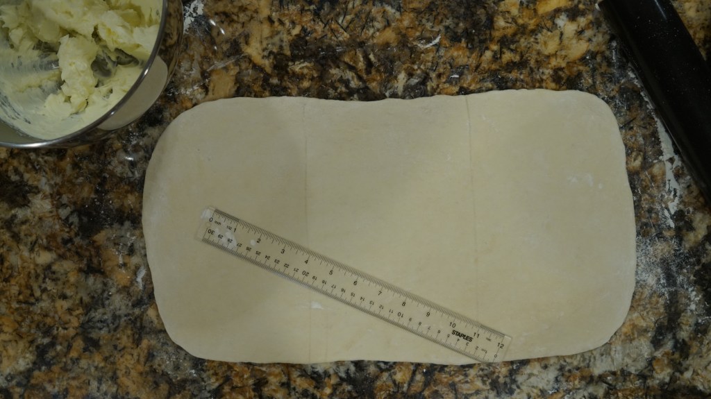 Using your fingertips, starting at the left side of the dough, smear the butter over two-thirds of the dough (the left section and middle section – 6 inches each). Leave the right section of dough unbuttered (the third sections of 6 inches). Fold the unbuttered section of dough over the middle section, and then fold the buttered left section over unbuttered third. The first fold is done.