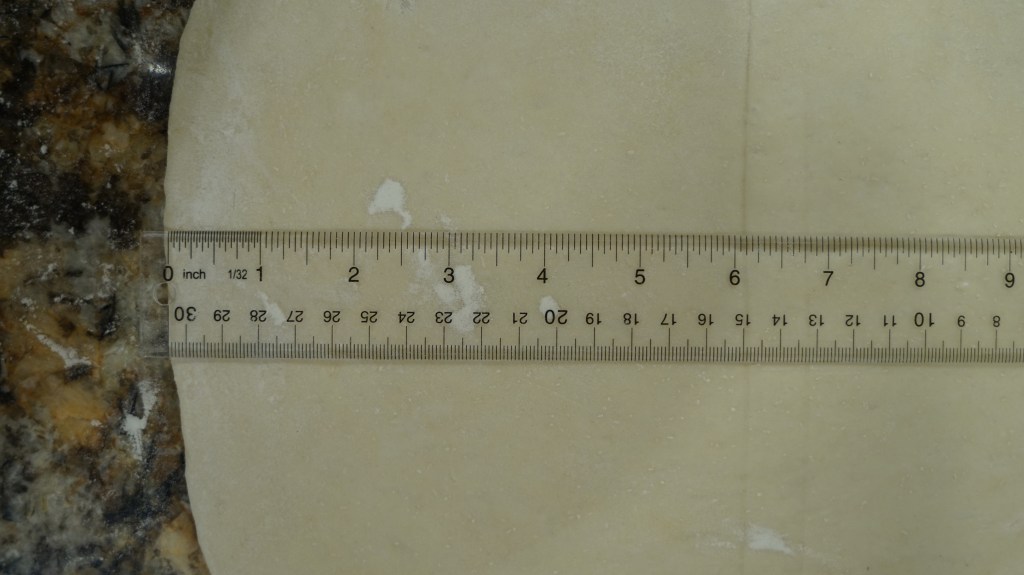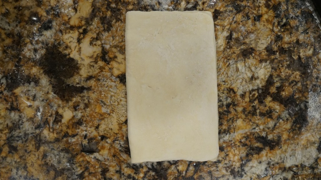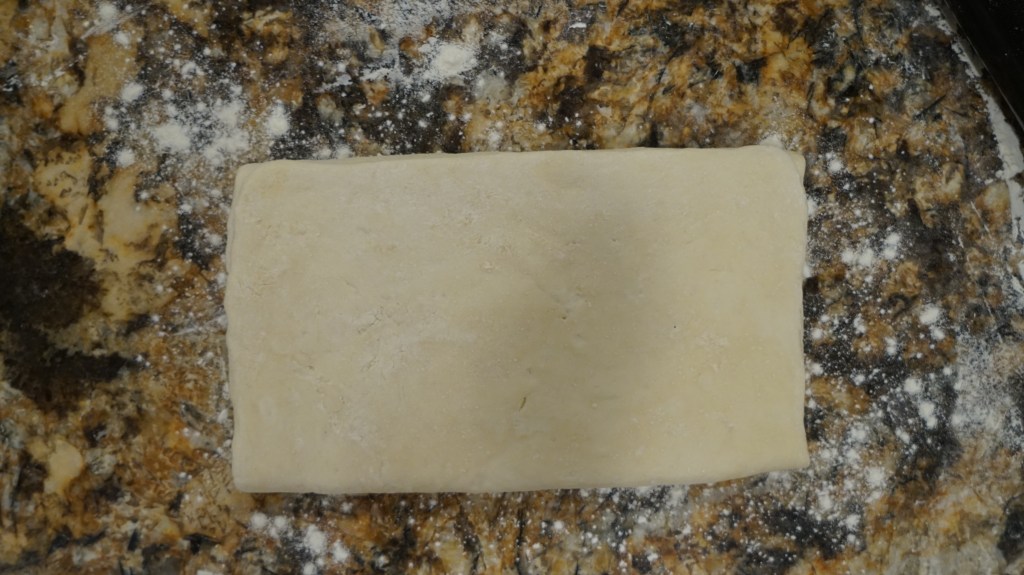 Unwrap the dough and place it onto a lightly floured work surface. Using a rolling pin, roll out the dough into a large rectangle measuring about 18 by 10 inches. Rotate the dough if needed to prevent from sticking to the work surface. Use flour if necessary. Brush off the excess flour before folding.